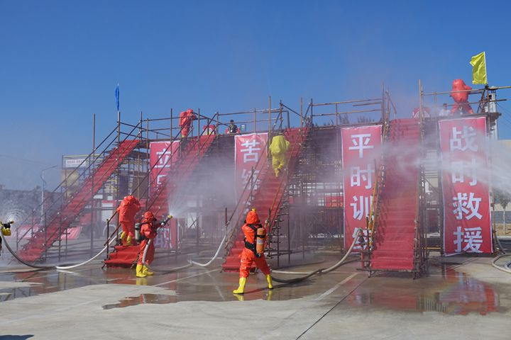 本屆競賽個人項(xiàng)目設(shè)置了理論考試、綜合體能、帶壓快速堵漏、單兵搶險救援等四大科目,集體項(xiàng)目為化工裝備初期火災(zāi)處置,競賽科目設(shè)置立足救援任務(wù),理論與體能相結(jié)合,技能與演練相結(jié)合。個人技能體現(xiàn)“實(shí)戰(zhàn)”,個人技能科目要求先佩戴呼吸器后競賽,模擬在實(shí)戰(zhàn)情況下完成競賽科目。綜合演練體現(xiàn)“實(shí)景”,最大限度還原事故現(xiàn)場。