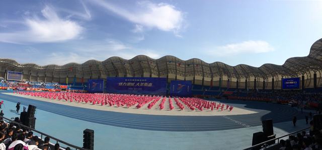 現(xiàn)場展演中,歌伴舞《我和我的祖國》,150 名舞者在場內(nèi)翩翻起舞,將開幕式推向高潮,體現(xiàn)了歌頌祖國,祝福祖國,全民健身,全民參與的開幕式宗旨;鼓與武術(shù)表演《鼓舞湖城》,選用56名鼓手敲擊28面立式大鼓和700名武術(shù)愛好者共同表演的形式,展現(xiàn)出56個民族團(tuán)結(jié)進(jìn)步、共同繁榮發(fā)展的歷史進(jìn)程,激勵人們團(tuán)結(jié)奮進(jìn),取得更大的成就;抖空竹表演,由衡水市空竹協(xié)會組織的300名空竹愛好者,著統(tǒng)一服裝,共同抖出衡水人的精神,抖出衡水人的風(fēng)采,抖出衡水人的干勁,意在體現(xiàn)衡水人多年來取得的輝煌成就。