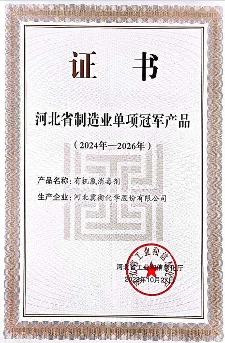 近日,河北省工業(yè)和信息化廳公布了《2024年河北省制造業(yè)單項冠軍企業(yè)名單》,河北冀衡化學股份有限公司憑借其在有機氯消毒劑行業(yè)領先的制造技術和全球領先的市場份額,榮獲“河北省制造業(yè)單項冠軍產(chǎn)品”稱號。
